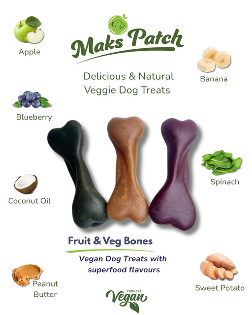 View full detailsMaks'Patch Fruit & Veg Bones Vegan Dog Treats with Superfood Flavours Bursting with natural goodness, Fruit & Veg Bones are delicious, m...